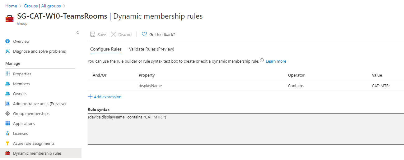 - And fill in the Rule syntax field the following syntax: (device.displayName -contains "CAT-MTR-"). Change the CAT-MTR to your device naming template.