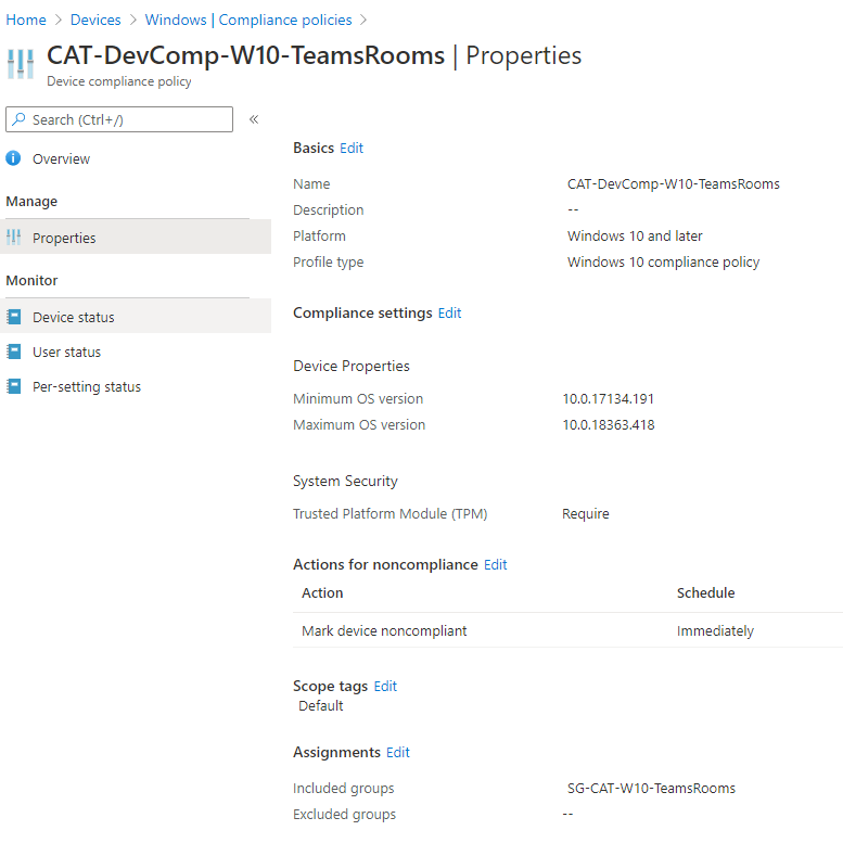 To get an insight if your active Microsoft Teams Rooms are still compliant, you can create a Compliance policy. With this Compliance policy, you can set for example, the minimum and the maximum OS version, if the MTR requires a TPM and so on.